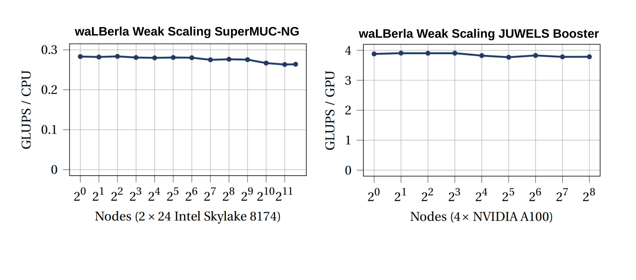 WaLBerla is designed for performance across scales. Written in modern C++20 and utilizing vectorization, OpenMP, CUDA and HIP, the framework makes the most of modern parallel processors of all sizes. Its block-structured computational grids allow for efficient distributed parallelization, effective meshing and grid refinement, as well as dynamic load balancing. Near-perfect scaling behavior has been demonstrated on state-of-the-art supercomputers, such as SuperMUC-NG, JUWELS Booster and LUMI-G.